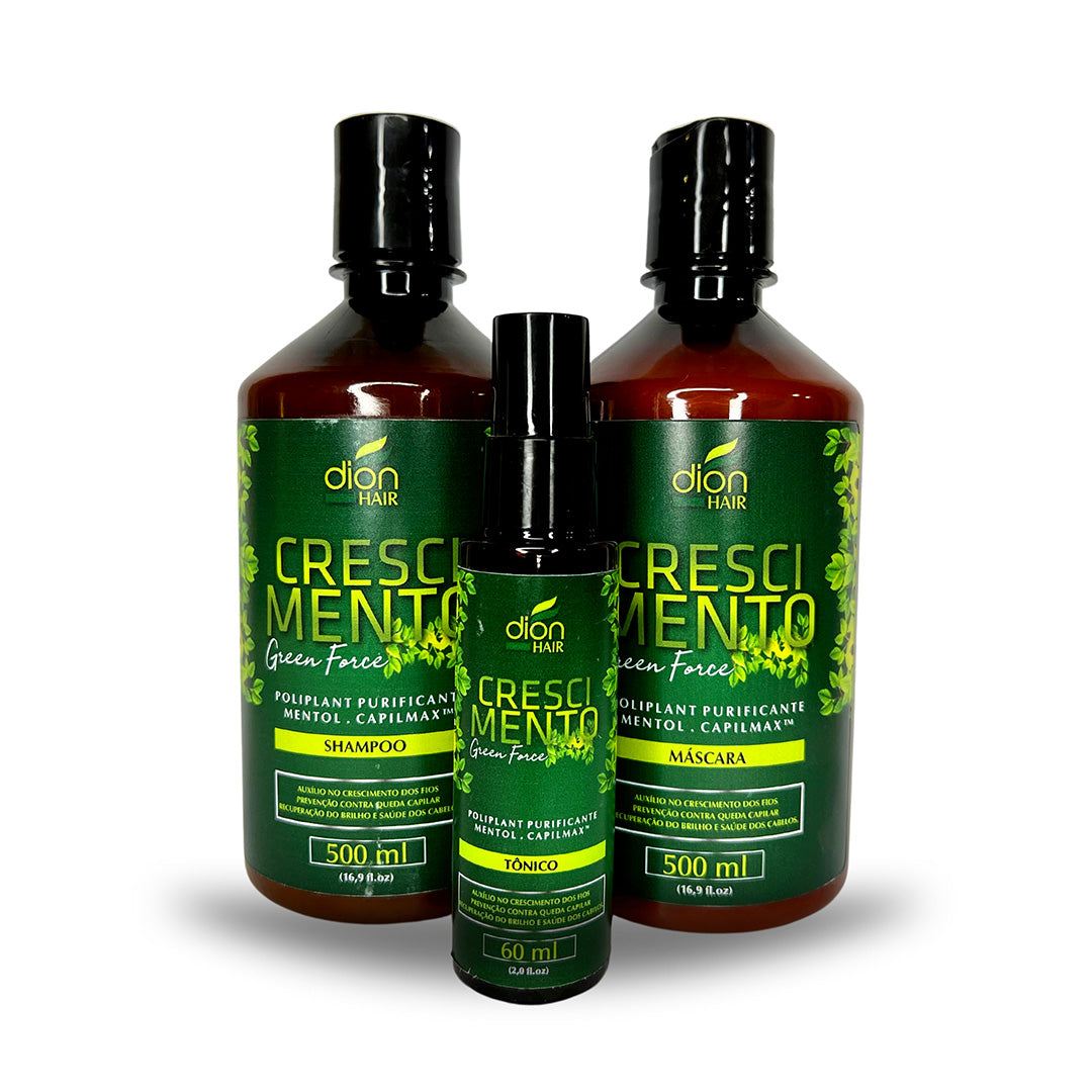 The Green Force Growth Line from Dion Hair has a dermatologically tested formulation that helps promote healthy hair growth. Enriched with Purifying Poliplant, Menthol, and Capilmax™, they work together to strengthen weakened hair that is prone to breakage. Use the complete line to enjoy all the benefits. Kit includes: 01 - 500ml Shampoo, 01 - 500ml Mask, 01 - 60ml Tonic.